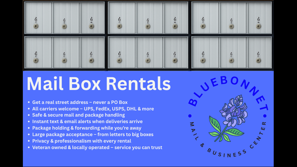 Tired of missed deliveries, porch theft, or the limits of a PO Box? At Bluebonnet Mail Center, we give you more than just a mailbox — we give you a secure street address, peace of mind, and professional convenience. Whether you’re running a business, working from home, or just need a safe place for packages, our private mailboxes are built for security, flexibility, and trust.